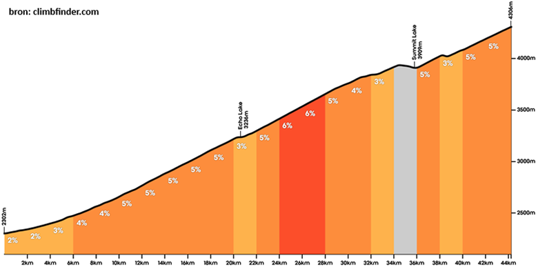 | 5 juli 2019 Het is heerlijk zonnig als we beginnen aan de klim naar de top van de hoogst geasfalteerde weg van Noord-Amerika, de Mount Evans. De weg is 14 mile (23 km) lang en reikt tot een hoogte van 14.130 feet (4307 meter). We rijden langs de auto's voor de tolpoort en beginnen aan de klim. Het is een schitterende omgeving die alleen maar mooier wordt hoe hoger we komen. Ik zie geiten en talloze marmotten. De weg is nooit steil en het is prima omhoog fietsen. De enige tegenstanders zijn de wind en de ijle lucht. Als ik de 4000 meter grens passeer stop ik voor een foto van mijn Garmin. Een paar maanden geleden deed ik dit ook op de Pico Veleta in Spanje bij 3000 meter. Nu ben ik echter 1000 meter hoger dan destijds en dat is een vreemde gewaarwording. Het laatste deel is een hele serie haarspeldbochten die redelijk kort op elkaar liggen. Ik stop om de bijzondere sneeuwgeit op de foto te zetten die hier leeft op grote hoogte. Later zie ik er nog veel meer. Op de top is het erg druk met auto's en toeristen. Ze hebben allemaal respect voor onze prestatie om tot deze hoogte te fietsen. Zelf vinden wij het al heel normaal, maar inderdaad het is ook best wel een klus om hier naar boven te klauteren. Bij het pasbord laten we een enthousiaste Amerikaan een foto maken. De afdaling is een drama. Er liggen overal kleine gootjes dwars over de weg. Ik moet zelfs denken aan "Kedeng kedeng" van Guus Meeuwis. Geradbraakt kom ik beneden aan. Jammer van zo'n mooi klim en dan zo'n afdaling. En dan te bedenken dat voertuigen hier tol moeten betalen. Nu moet ik gaan nadenken welke klim uit mijn persoonlijke top-10 gaat verdwijnen, want deze komt daar zeker in. |