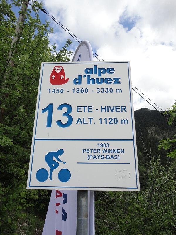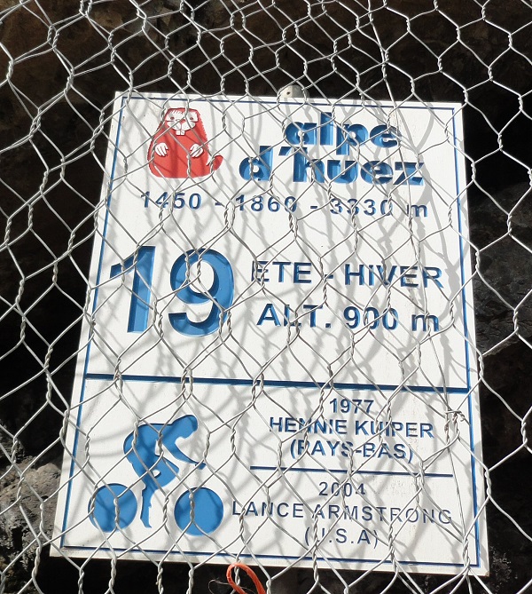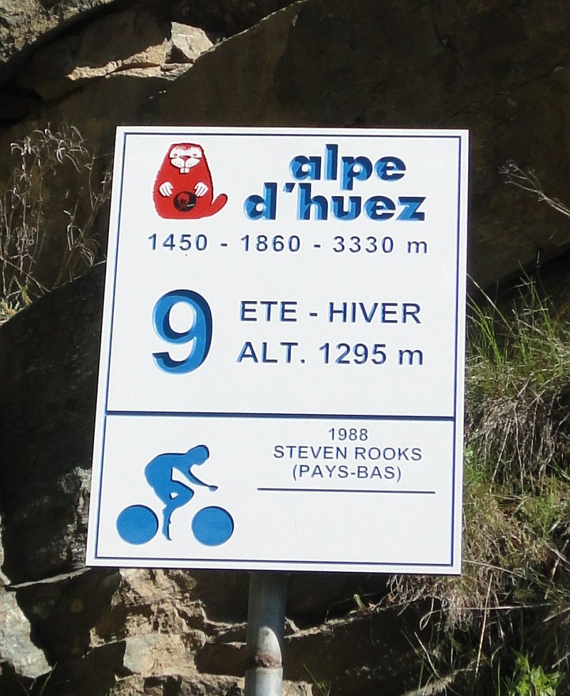 | Op de Alpe d'Huez heeft elke bocht een naam van een wielrenner die hier de etappe gewonnen heeft tijdens de Tour de France. |