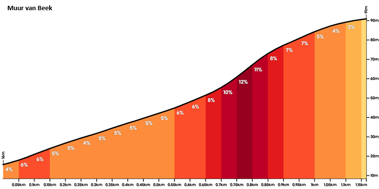 De Muur van Beek (Van Randwijckweg) in Beek-Ubbergen was op 7 mei 2016 de eerste gecategoriseerde bergsprint in de 2e etappe van de Giro d'Italia. Deze steile klim, met maxima tot 12%, speelde een hoofdrol in de rit Arnhem-Nijmegen, waarbij de eerste blauwe bergtrui van die ronde werd verdeeld. De Nederlandse wielrenner Maarten Tjalingii had zijn zitten gezet op de blauwe bergtrui, zat in kopgroep, maar werd net tweede op de klim. |