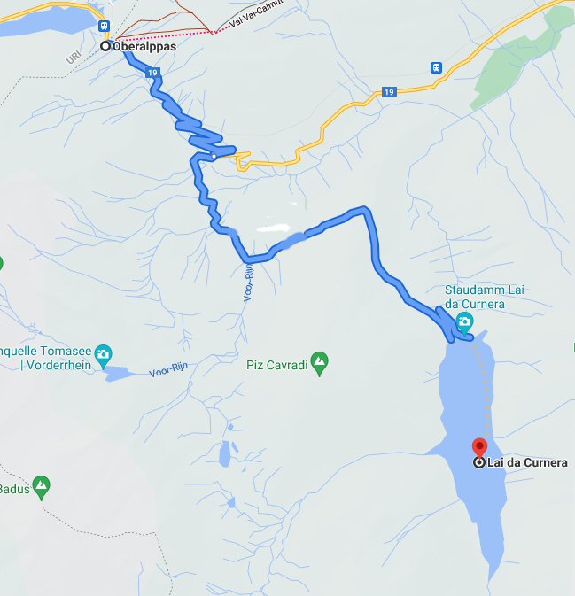 | Als je van de Oberalppass afdaalt richting Disentis dan is er na een paar kilometer een afslag naar rechts. Er staan diverse wandelroutes op gele bordjes waaronder de Lai da Curnera. Een smal asfaltweggetje loopt hier omhoog. Onderweg een slagboom waar je langs kunt fietsen. Het is gemeen steil maar het is kort. Al snel zie je de stuwdam liggen en daal je een stukje af. Hier een fraai uitzicht op het meer en dam. Je kunt nog helemaal afdalen om op de dam te komen. |
