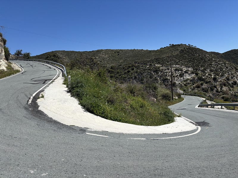 De klim is geleidelijk, maar dat wordt anders bij het dorp Akoursos, waar een paar pittige haarspeldbochten met percentages boven de 10% liggen te wachten. Het dorpje Kathikas heeft een fraaie kerk en plein met aantal borstbeelden van militairen die streden voor behoud van Cyprus in 1974. |