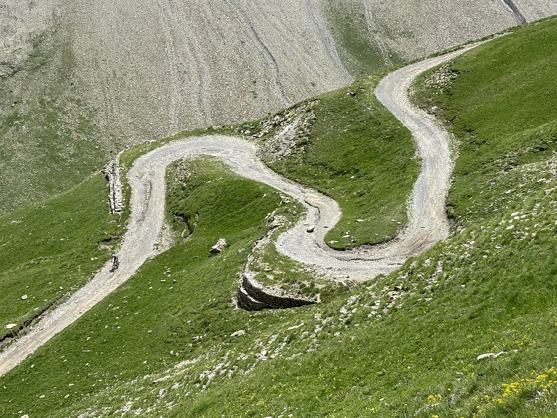 | 28 juni 2024 Het is tijd voor de gravelfiets, want we gaan de Col du Parpaillon fietsen. Deze klim is 12 kilometer onverhard, alleen weten we niet wat met onverhard wordt bedoeld. Daar zullen we snel achter gaan komen. We parkeren de auto net buiten Les Pras en starten aan de klim. Na 1 kilometer heeft Theodoor de ketting gebroken en die kunnen we snel repareren met de toolset en sukkellink van Frank. Zelf heeft Frank iets verderop een lekke band en dit blijkt wonder boven wonder het laatste malheur te zijn. Arend gaat de klim rennen en dat gaat zelfs sneller dan fietsen. Knap hoor! Het wegdek is erg slecht en er moeten zelfs stukken gelopen worden. Met slecht bedoel ik grote keien, grint, zand en als je geluk hebt gravel. Bert heeft te dunne banden en draait om. De rest ploetert door. Het is een loodzware opgave door de stijging van 10% en het vreselijke wegdek. We helpen elkaar door een waterstroom, maar dat voorkomt niet een nat voet. (op de terugweg de andere voet) Hoe hoger we komen hoe mooier het uitzicht en de omgeving. Er is hier niemand. Je hoort de marmotten, maar je ziet ze niet. Na een dikke 10 kilometer is de weg dichtgesneeuwd en besluiten we het laatste stuk niet te doen. Het risico is simpelweg te groot. Afdalen is trouwens ook een hele uitdaging onder deze omstandigheden. We komen gelukkig allemaal weer heelhuids terug bij de auto's. Ik besluit met Theodoor terug te fietsen naar het hotel. Onderweg nog even kijken bij een oud fort, Fort de Tournoux. Het is warm, heel weg warm. Vandaag een klim af kunnen vinken van mijn verlanglijstje. Wat een prachtig avontuur was dit! |